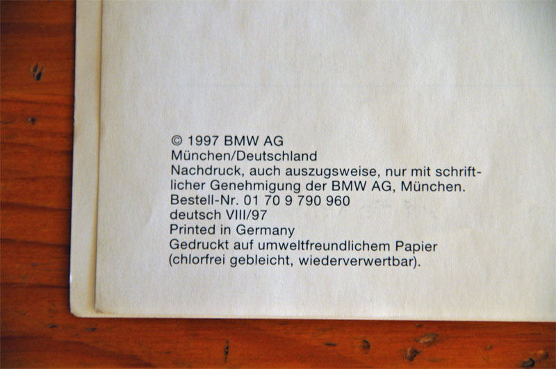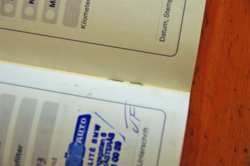 Det är naturligtvis något fel om serviceboken är tillverkad efter bilen. En -96 med en fullsmetad servicebok från -97 har med 98 % sannolikhet felaktig mätarställning. De sista 2% är när ägaren kan styrka att det rör sig om en "ersatz" servicebok från BMW. Kolla även att "Bestell-Nr" på samma sida stämmer med "Best. No." på baksidan (se nedan). Om inte är alla blad utbytta.