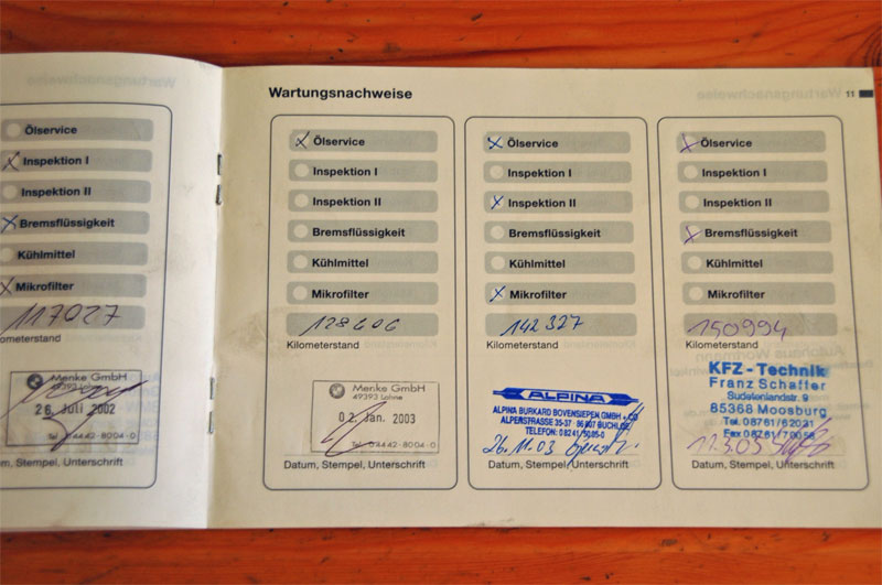 Det är mycket viktigt att ha servicen dokumenterad på bilen, både i Tyskland och i Sverige. Existensen av en servicebok får dock absolut inte tas som en indikation på att mätarställningen är riktig. I princip kan man säga att de flesta mätarskruvarna, undantaget dom mest amatörmässiga, förser bilen med en förfalskad servicebok. Och den förfalskningen kan vara allt från klumpig till omöjlig att avslöja utan att kontakta serviceställena i den. Att dra några slutsater bara genom att titta på bilen är inte möjligt.