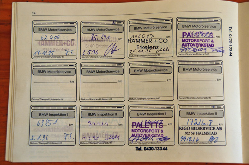Observera att jag säger servicedokumentation. Dokumentationen behöver inte bestå av en servicebok, utan utdrag från BMW eller kvitton är till och med bättre att ha. Det viktigaste är att säljaren kan bevisa att bilen är servad enligt anvisningarna. Nedan visas de viktigaste punkterna för att säkerställa att serviceboken är ärlig.