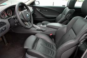 Invändigt känns nya 7-serien igen både i design och materialval. Detta betyder att 645Ci ser lika modern ut invändigt som utvändigt. Samma snygga mätare och en aluminumbeklädd mittkonsoll som ser nästan exakt ut som den i 7-serien. Den stora skillnaden är ratten, där provbilens helt underbara sportratt är rejält knubbig och superskön att hålla i. Kvalitetskänslan är hög och materialvalen är rejäla både avseende skinn, trä och plast. Möjligen med undantag av plasten runt växelspaken, som känns lite trist i förhållande till all snygg aluminium runt omkring. Provbilen var också extrautrustad med panoramataklucka i glas, som gjorde kupén mycket ljusare. När det eldrivna skyddet dras för glastaket märks det direkt hur mörkt det blir inne i bilen, men å andra sidan kanske det blir lite för mycket av det goda när solen gassar. Takluckan går bara att hissa upp i bakkant på grund av att den tar upp nästan hela taket, så den är mest tänkt som ljusinsläpp. Kort sagt ett mycket trevligt utrustningsalternativ!