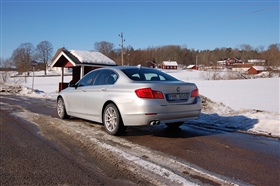 Jag startar upp motorn i den första av två 5-seriebilar jag skall prova under dagen. Det är nya 523i som fått en uppgraderad version av den 6-cylindriga 3-litersmotorn. Den ger 204 hk och 270 Nm över ett brett varvtalsområde. Kopplad via den utmärkta 8-växlade automatlådan ger den bilen fullt acceptabla prestanda och framför allt en mycket gynnsam förbrukning på blott 7,6 l/100 km.
