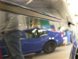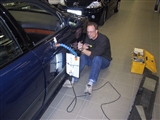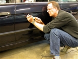 Conny arbetar väldigt snabbt. Medan jag byter några snabba ord med försäljaren på LO's Bil, som lånade ut lokalerna till oss, har han riktat bakdörren. För att förenklat beskriva hur arbetet går till så består det av två moment. Först trycks bucklan ut inifrån, varefter Conny finjusterar utifrån. Hela arbetet kräver bra belysning och mycket bra syn för att resultatet ska bli bra.