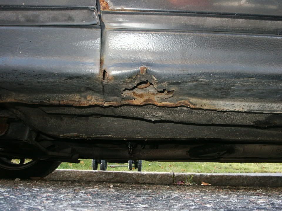 | jag hade likadant på min.. kapa ur all den rostiga plåten o gjorde ny plåt hemma i garaget:) sket i domkrafts fästet men man kan ju förstärka innan om man vill ha kvar det. gjorde så på båda sidor tog mej inte ens en dag. kostnad blev 150 kr för en stor plåt plus lite svetstråd:P | |