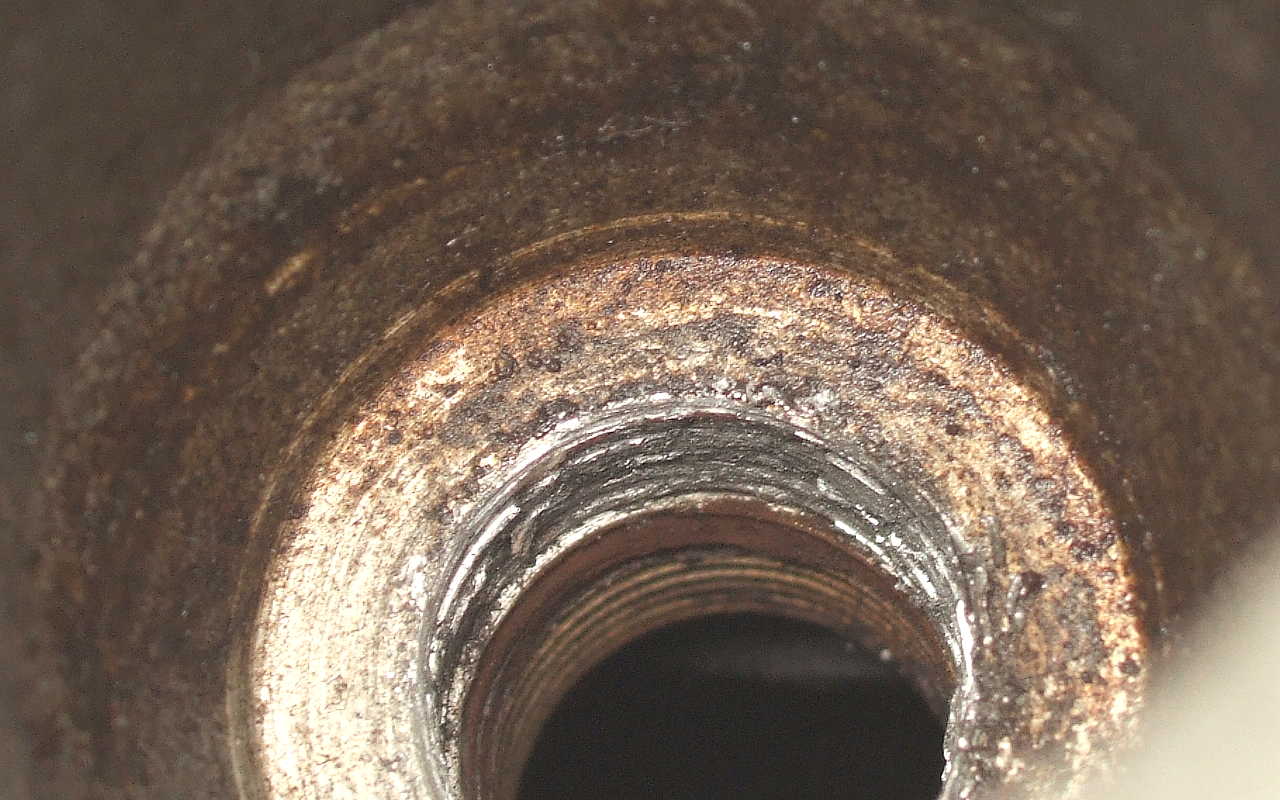 "Abolsut snyggaste lösningen hade ju varit att plana ned det..." Mmm, man kanske skulle knipa käft så inte farbror Murphy hör en. Gjorde rutinkontroll på tändstiften (har aldrig blivit av att jag byt själv - tidpunkt för byte har sammanfallit med mina enda, 2 st, verkstadsbesök). Gängpaj för tändstiftet Länk på femte cylindern. Iskruvad snett redan vid montering? Har den satt sig som satan själv på 2000 mil? I vilket fall som åker definitivt toppen av nu och in för helicoil behandling. |