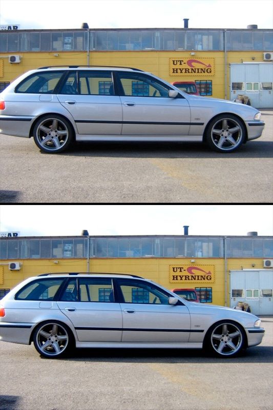 | Det ser ungefär ut som på min bil, dvs. den ska ner åtminstone 2-3 cm. till. Och som din bil ser ut nu så är den definitivt inte 50 mm. lägre än original. Måste man verkligen ta till coilovers eller luftfjädring för att få en lagom låg e39 touring? | |
