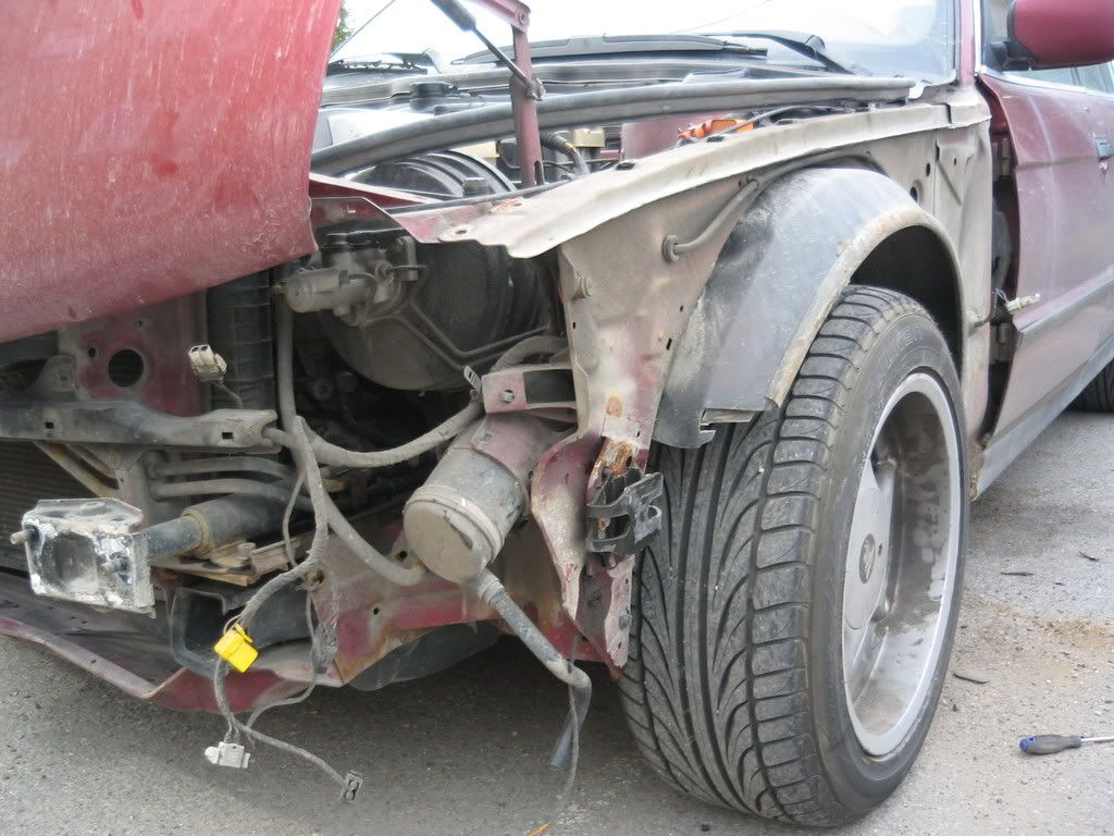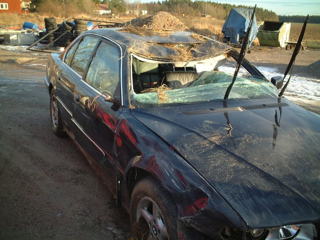 Nu var min bil bara halvförsäkrad så att få något från försäkringen var inte att tänka på , dock talade jag lite med karossverkstaden som fick vraket av bärgningsbilen och de bara skrattade när ord som "reparation" kom på tal , runt en halv mille var summan de slutade räkna vid , när jag fick lite snabbt förklarat vad man behöver göra med en bil där ALLT skall bytas så förstod jag ganska snabbt det komiska i att försöka reparera en voltad 10 år gammal bil.