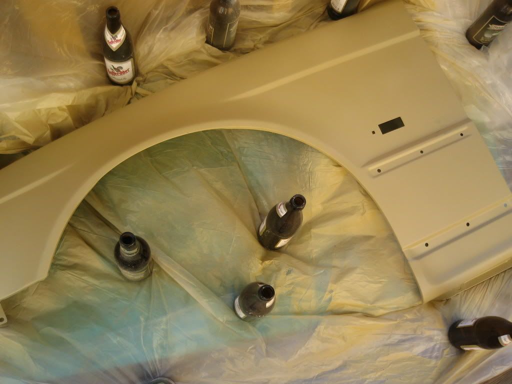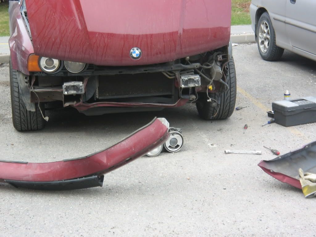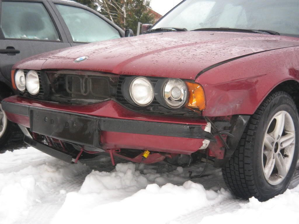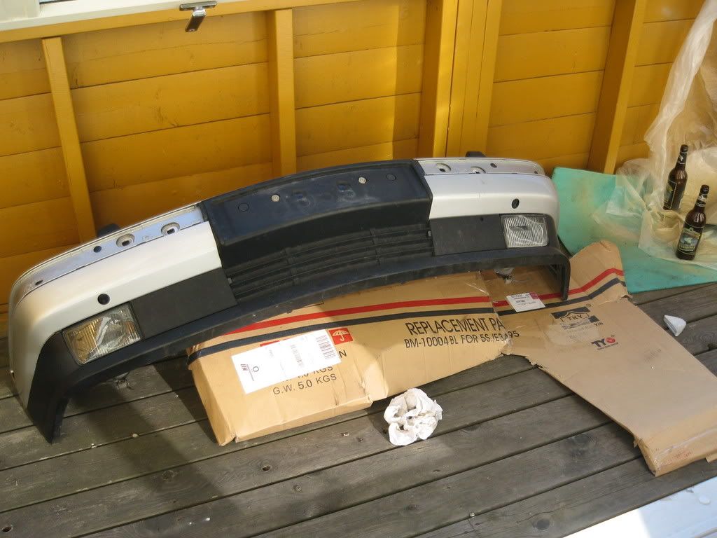 Jag rev skärmen, stötfångaren och lycktan, köpte en begagnad fångare med fel färg samt nya delar för totalt 2000 norska kronor och monterade dom dit.