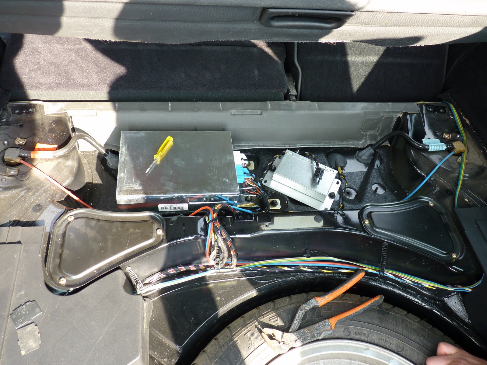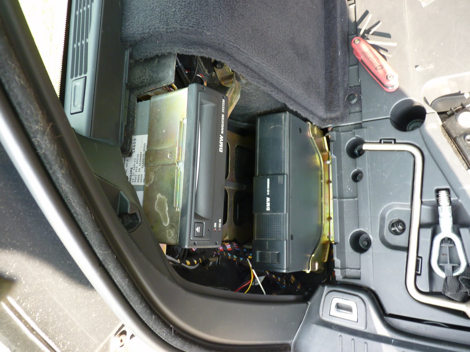 Ingen av de båda boxarna är radio eller huvudenhet till stereon. Vad de innehåller är lite beroende på vad du har för utrustning, men bl.a videomodul för TV-DVD brukar sitta i denna regionen. Som skrevs ovan: Under klädseln till vänster i skuffen, bakom hjulhuset hittar du telefon, radio, navienhet mm FP |