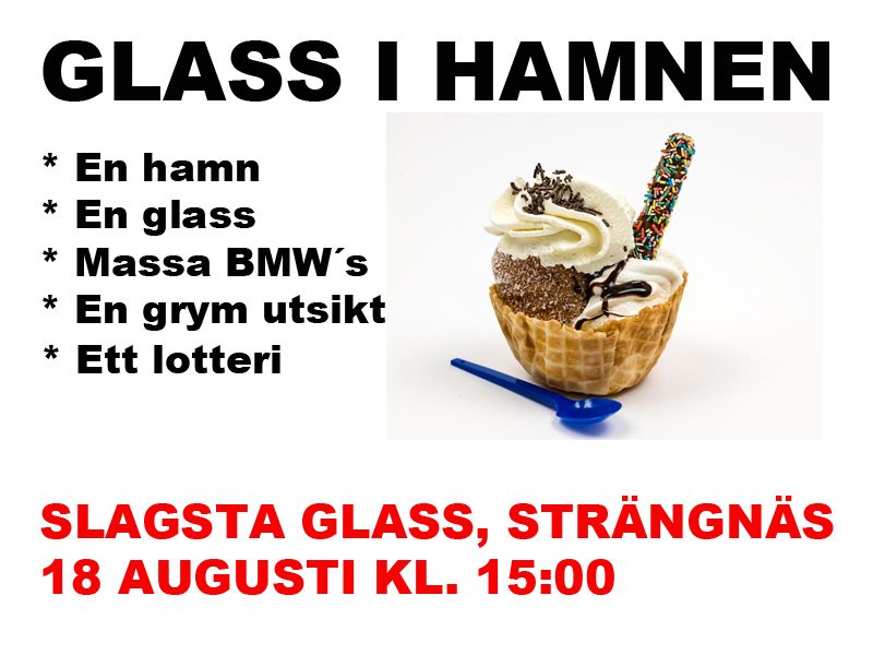 Länk En mycket vacker hamn, enormt god glass, finfint väder (förhoppningsvis) , ett lotteri och en massa BMW´s. Det är vad som väntar lördagen den 18 augusti i Strängnäs hamn vid Västervikstorget (slå in denna adress på din GPS/smartphone, om du inte hittar). En härlig motorkväll med underbar utsikt, helt enkelt. BIMMERS OF SWEDEN & Slagsta Glass anordnar denna lilla träff, lördagen den 18 augusti kl. 15:00. Träffen hålls på Västervikstorget i Strängnäs, vid Slagsta Glass lilla bod. Träffens enkla upplägg: * Kom med din BMW (bil eller motorcykel) * Käka en god glass * Delta i det enkla lotteriet för alla med BMW (se info nedan) * Spana in bilar och motorcyklar på plats * Ha en trevlig stund ihop med likasinnade ________________________________________________________ Lotteriet går till så här: * Köp en valfri glass på plats mellan kl. 15:00-15:45 (kom ihåg tiden). Visa din BMW-nyckel när du köper din glass. Du får då en lott. * Vid lämplig tid ca. kl. 16:00 håller vi dragningen. * Priserna består av presentkort hos Slagsta Glass. * 100 stycken lotter finns. Först till kvarn gäller och ENDAST BMW. Enkelt, gott och skoj. ________________________________________________________ Det kommer gå att köpa våra små dekaler och stora streamers på träffen. Säg till mig på plats bara. I bildlänken nedan ser du var glasskiosken ligger. Där ser du också ett rödmarkerat område. Det är huvudparkeringen där vi står i första hand. Den gulmarkerade linjen är andrahandsvalet för parkering. Vårt tredjehandsalternativ är det blåa området. Översiktsbild ---> Länk VIKTIGT: Glasskiosken ligger nära ett bostadsområde där det är många människor i rörelse. Se därför till att köra lugnt till och från träffen. Kolla gärna in Slagsta Glass meny här ---> Länk Väl mött lördagen den 18 augusti, klockan 15:00. | |
