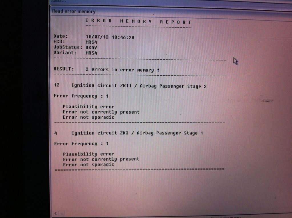 Om airbagen är satt som inaktiv i systemet så måste du dra ur kabeln ur airbagen annars får du felkod. Så om passargerarairbagen är inkopplad så prova att rycka ur kabeln och sedan radera felkoderna. /Micke |