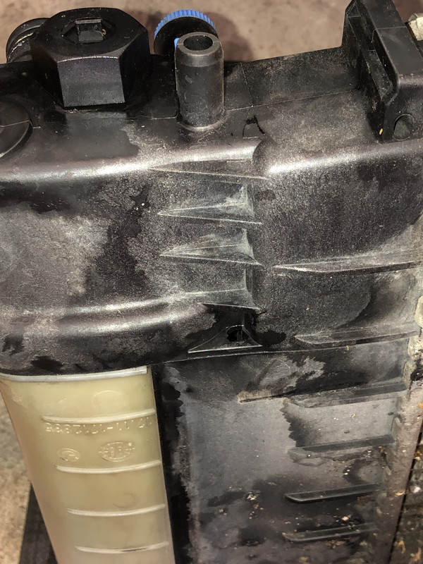 Kan tillägga att bilden är på den gamla kylaren. Ser ut som att det läcker från det hålet på den nya och även att det läcker mellan expansion och kylare. Men bara när bilen är igång. |