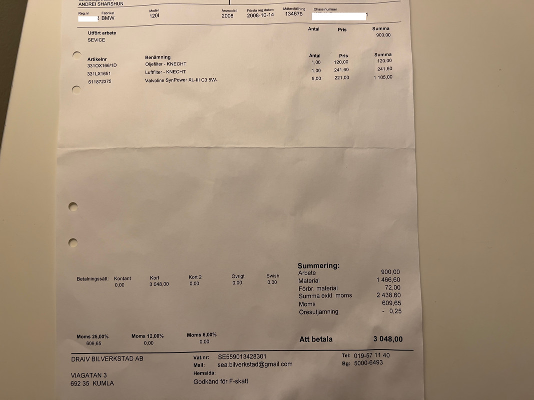 Gott om pengar vette fan ;) men tänkte unna bilen nya tändspolar i samband med nya tändstift. Kanske lite överdrivet men har inte sett enligt tidigare dokumentation som finns att någon av tändspolarna tidigare blivit bytta. Tänkte att det kanske var dags efter 13500 mil. Bra tips där med att spara de som är friska. Det ska jag be polaren att göra. Dessvärre har jag endast gjort en lite längre körning sedan jag köpte bilen 1/11 och den körningen var på totalt 10 mil annars är det bara kortkörningar. Har ca 8 km till jobbet och ca 3 km till gymmet/padelhallen så blir tyvärr sällan någon längre tur. Bifogar servicekvittot men det står KNECHT. Bilen har gått typ 110-120 mil sedan olja och filter byttes. Länk |