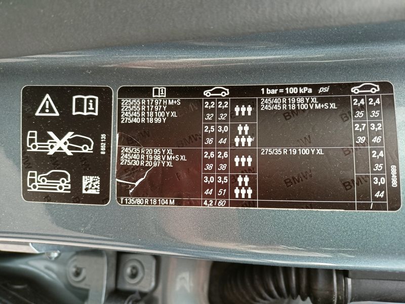 Hänvisar inte även din instruktionsbok till en tabell som tar hänsyn till lätt last respektive full last? Min bok (för en annan bilmodell) hänvisar till skylten i dörröppningen (förutom att iDrive 7 visar rekommenderade tryck som tar hänsyn till däcktemperaturen.) Skylten anger dessutom olika tryck för olika däcktyper/däckstorlekar/fälgstorlekar. Vid de flesta kombinationer och lätt last rekomenderas samma tryck bak som fram. |