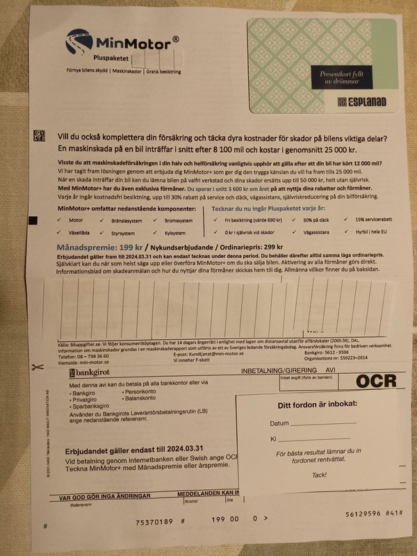 Hej Fick detta försäkringsbrev hem i brevlådan i dagarna från ett bolag som kallar sig "MinMotor". Detta brev ska vara en komplettering till din vanliga bilförsäkring. Denna försäkring skulle täcka te x ett motorhaveri upptill 25000 mil, vilket för min försäkring (If) är upptill 15000 mil. Man kan då få en ersättning upptill 50000 kronor. Samma gäller bränslesystem, bromssystem, växellåda, styrsystem och kylsystem. Är denna försäkring legitim?? Om den är det så kan jag tänka mig den eftersom jag tänker ha bilen länge. Nykundserbjudande 199 kronor per månad sen 299. Har googlat på det och det står mycket positivt om dem, nio av tio nöjda kunder men tänkte höra med er om ni vet nåt om denna försäkring. Kolla länken. Länk | |