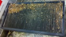 "Bort med filtret och spraya sedan in där filtret satt med kupefläkten igång. Ju närmare du kommer till det du vill nå desto bättre." Lättare sagt än gjort.... Med filtret urtaget så blåser det på ordentligt därifrån. Det mesta som sprutas in kommer ut illa kvickt :-) Så jag fick stänga filterlådan utan filter i och spraya vid luftintagen. Vet inte om det kom in tillräckligt dock. Sprayade in lite i filterlådan med fläkten avstängd så att kylflänsarna fick sig en liten dusch i alla fall. Nu är det riktigt frisk luft i alla fall. Dock finns en liten odör kvar precis vid start, så är säkert lite bacilusker kvar ändå... Microfiltret behövde i alla fall bytas... Stod 2001 på det. Bifogar en bild så får ni se nåt fint. Länk Dessutom var filterlådan till hälften fylld av björkfrön, tallbarr och lite annat smått och gott :-o |