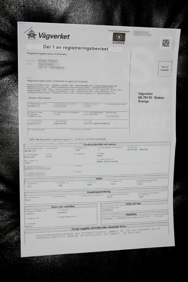 Hej! Nu har vi varit hos Råå Bilcenter. Vi började med att fråga hur det gått med lackeringen av frontspoilern. Han svarade vänligt med att "kofunkaren" var färdig, den är i toppskick. Vi frågade om det skett någon kontroll av milantalet som lovat. Det hade det inte, men vi fick gärna ta bilen till Paulssons Bil om vi så önskade. Vi berättade att anledningen till att vi frågar är för att vi hittat din bil på mobile.de och att bilen där hade gått 21.000 mil! Han svarade med en argsint min att det absolut inte var samma bil. Han tittade snopet på att annonserna som om det vore en dödsannons. Vi sa att vi gärna tog med bilen till BMW för kontroll och påpekade att vi behövde regbeviset. Det fick vi (se bild). Vi tittade även i serviceboken denna gången, som för en gångs skull fanns på plats. Bilen var servad var 1500 mil på samma firma, samma stämpel och samma penna, HMMM. Dom två sista stämplarna var från en auktoriserad BMW-verkstad. Det hela slutade med att vi bestämde att vi återkomma nästa helg. Vi kommer i veckan åka upp till BMW för att se vilken information chassinumret ger oss. To be continued... Regbeviset: Länk MVH / Jacob & 1BJÖRN |