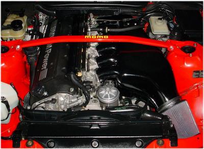 Bild på motorn samt stoltheten, kolfiberinsuget som fick bilen att få ett ljud som inte går att slå.