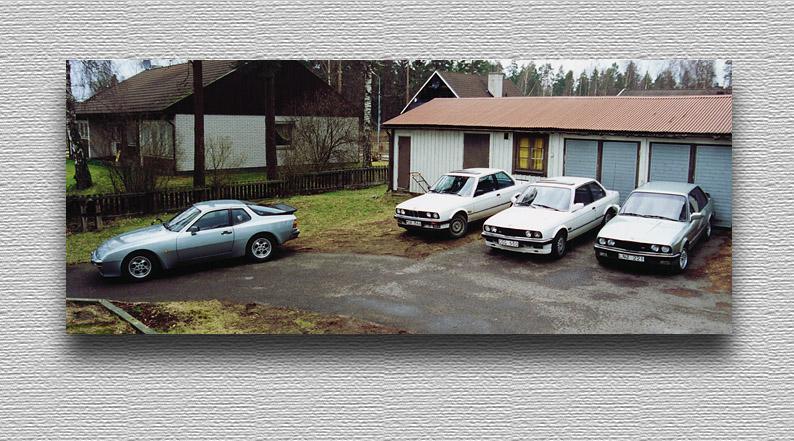 En härlig tid! Vi var 19 & diggade våra bilar hårt. Från vänster kusinens Porsche 944. En imponerande bil när det gällde att gå fort - & det gjorde det jämnt kan jag lova. 2,5l. 4-cyl & 163 hk, dock kunde den inte rå på min 320 2,5 upp till 200 men se´n. . .aldrig slöare än 240 & ibland 260. Men då fick man ha lyktorna nedfällda! Sedan 323 -86, stram & lite lagom trist att köra men OK komfort. Se´n kompisens 318i. Gick bra för att bara ha 105?? hk. Se´n min 320. |