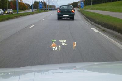 ACC:n har låst på bilen framför men kan hålla önskad hastighet. Samtidigt meddelas att jag ska svänga av åt höger om 80 meter.