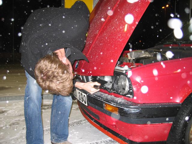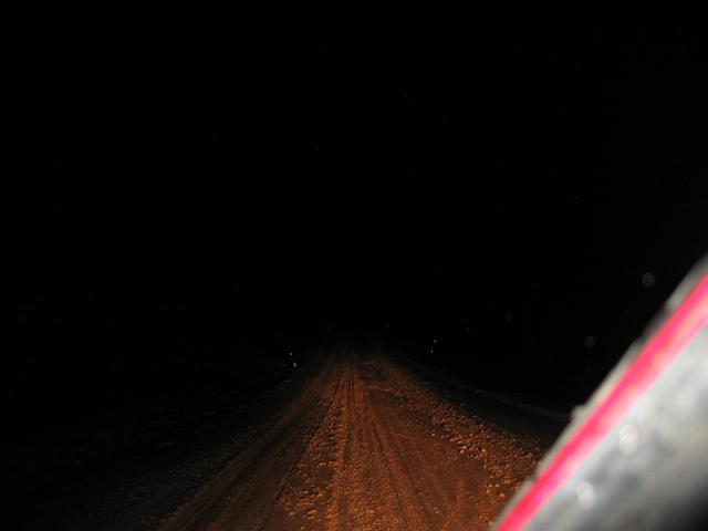 Vi kommer inte så långt innan vi märker att framåtsikten börjar blir för dålig. Strålkastarna lyckas helt enkelt inte lysa upp vägen lika bra som väntat. Det visar sig att bilens lyktor har börjat snöa igen vilket gör att ljuset inte tränger igenom lika bra.