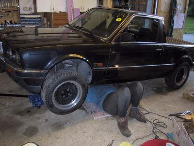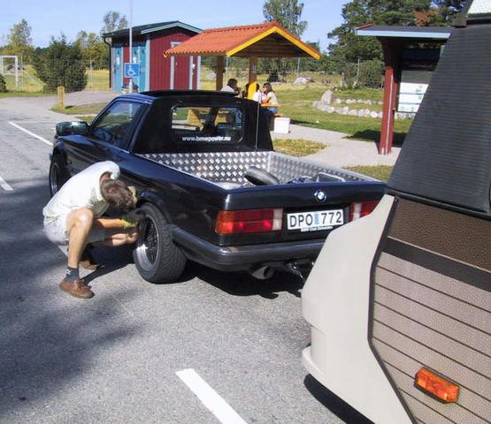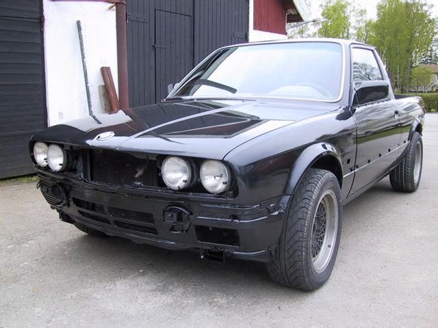 Så där ja. Projekt 2001 i det närmaste färdigt. Det började som en vild idé strax före jul. Såsom varande villaägare står man i ständigt behov av en mindre släpkärra eller liknande. Men en sådan tar upp en bilplats vilket gör ett samtidigt ägande av eventuellt hobbyfordon lite problematiskt. Varför inte förena dessa två motpoler i en, var min tanke. En E30 är ju inte direkt känd för sitt spatiösa baksäte i vilket fall som helst. Dessutom var bilen i kraftigt behov av en större översyn samt en mindre karossrenovering. Sagt och gjort, planerna drogs för att bygga om 323:an till pickup.