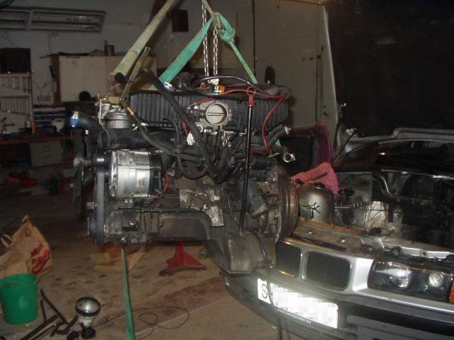 Jag slår till på en av dessa, 325-motorn är bortlovad men 525-motorn borde duga lika bra. Jag hämtar den med släpkärra och drar hem den till Åke, som hunnit lyfta ur den gamla motorn. Vi konstatera att en hel del grejer skiljer mellan E34 och E36, bland annat placeringen av elkomponenter och även utförandet av oljetråget. Att jag åker 525:a också är ingen nackdel, det går då lätt att konstatera vilka skillnader som finns, särskilt vad gäller komponentplacering. Det känns onödigt att behöva joxa med detta så jag ringer Pelle på Ansta och frågar om den andra motorn, den som kommer från en 325 coupé med mätarställning på 14.000 mil. Efter viss tvekan, den skulle ha varit hämtad för länge sedan, så får jag ta den motorn i stället. Mycket bra. Jag tar och lastar på 525-rovan på släpet och åker till Ansta igen, och får den nya motorn pålastad på släpet.