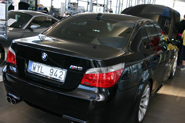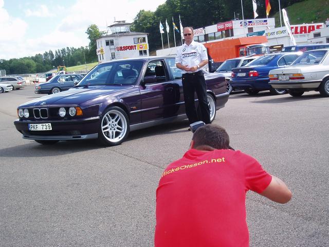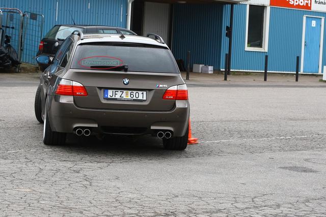 När vi kom ner i depån så får jag syn på en M5 E60 med minst sagt feta 21"-hjul. Sitter där lite på huk och ska plåta när jag får se ytterligare en M5 E60 i ögonvrån, och en till, och en TILL! WOOW!!! FYRA M5 E60 brevid varandra och i dessutom samma färg gör att man gölmmer att det ösregnar. Notera att det står en M3 E46 i bakgrunden. Den märker man knappt, snacka om att bli helt förblindad!