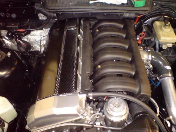 När vi mappade bilen så var insugstemperaturen något för hög. Därför fick vi montera bort frontspoilern för att få bra kylning. Anledningen till den dåliga kylningen är min AC Schnitzer front. Den har inte speciellt stort hål för luften. Och en unik kolfiberspoiler som denna kapar man bara inte upp utan vidare.