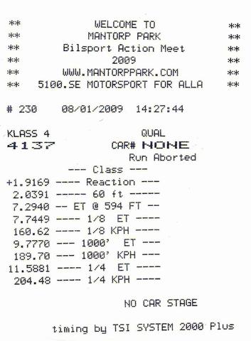 Min bästa tid på 402 meter blev 11.59 och en slutfart på 204.48 km/h. 60 fot på 2.04. Detta med vanliga gatdäck, alltså inte ens R-däck, utan helt vanliga Vredestein som jag släppt ut lite luft ifrån till 1.6 bar.