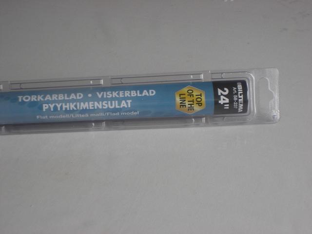 Åkte förbi Biltema idag och köpte 2 styck av deras flata torkarblad som enligt forummedlemmarna skulle hålla bra kvalitet. Biltemas tabeller rekommenderade 22 tum stora torkarblad till E34 karossen. Väl framme i bilen jämför jag de nyinköpta torkarna mot de befintliga och inser att det saknas ca 5 cm på varje torkare. Går in till biltema och ber att få byta till 24 tum stora torkarblad som för övrigt kostar lika mycket. 24 tummarna är något större än de Bosch torkare som sitter på, men jag tror att det ska gå bra ändå. Jag börjar med att montera torkaren på passagerarsidan och noterar att torkaren har svårt att följa böjen längst ut på E34ans vindruta, men det är enbart när torkaren är i vilotillstånd och jag tror inte att det kommer att inverka på torkarens funktion.