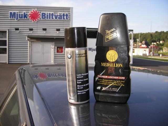 När det var klart så var det dags att ta sig an bilens skinninredning. Till detta använder jag BMWs egna rengöringsskum och Meguiar´s läderlotion.