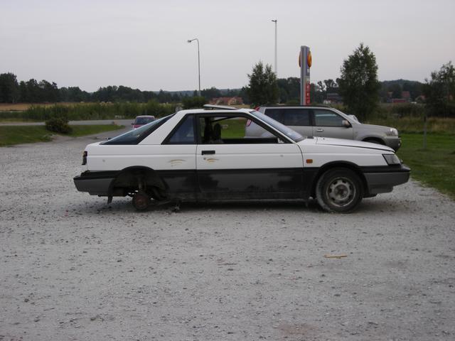 På en rastplats längs E4 fanns följande ekipage att beskåda. Det verkar som att ägaren har övergett bilen sedan ett försök till att byta däck misslyckats och därefter har vandalerna gjort sitt.