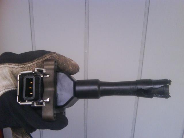 Idag undersökte jag misständning som ibland har förekommit enstaka gånger den senaste tiden. Den misstänkta tändspolen närmast torpedväggen visade sig ha spruckit i "tändhatten". Det kom sig av att jag demonterade den vid rengöring av oljeläckage vid tändstiftsbytet fär några veckor sedan, men monteringen blev inte bra.