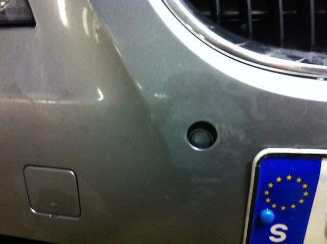 Ner i garaget för att se om det gick att fixa på egen hand. Upp med huven, men det var en massa plast i vägen. Jag bestämde mig därför för att ta bort ena grillen för att komma åt lite bättre. Det gick ganska fort bara man tog bort gummilisten i överkant. Då blottades fem stycken skruvar (torx 30) och med dessa borttagna gick det lätt att komma åt baksidan på grillen. Tog väl en 10-15 minuter allt som allt.