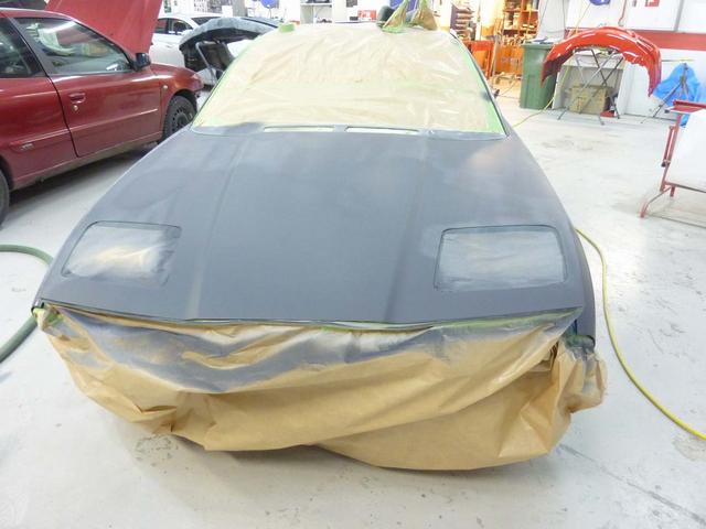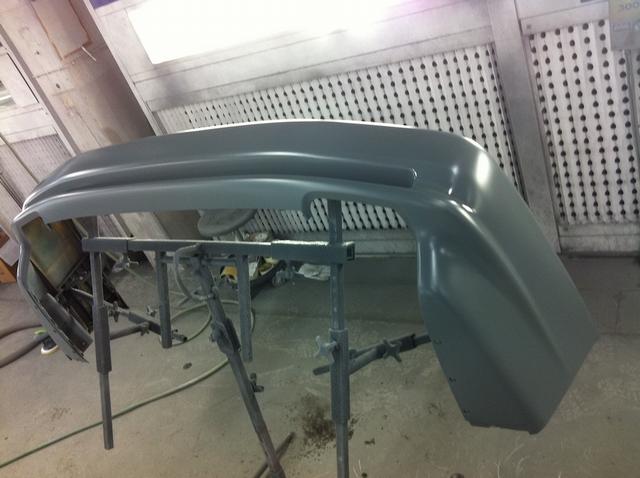 Idag var det dags att lämna in den bakre kofångaren på lackering. Naturligtvis hälsade jag på för att se hur arbetet framskred. Alltid en fröjd att se hur ett blästrat plaststycke transformeras till något vackert. Grundfärgen är på, allt borde vara färdigt till slutet av veckan. Därefter montering.