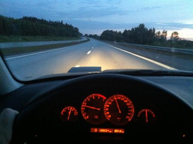 Resan hem blev perfekt eftersom jag fick tillfälle att prova kvällsbelysningen i kupén. Radion behöver helt klart bytas ut, men annars ser det bra ut. Lamporna i kliman fungerar perfekt. Jag imponerades också av helljuset som är helt suveränt. 40 minuters marschande i 140-160 knyck är aldrig fel.