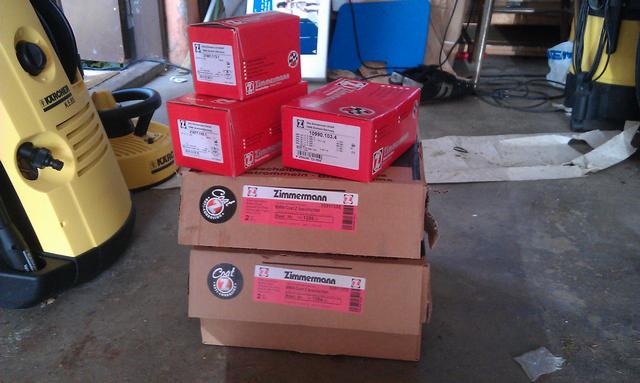 La därför en beställning hos en handlare på tyska eBay på ett kit med 4 skivor, belägg o handbromsbackar från Zimmermann för 2200 inkl frakt :-)