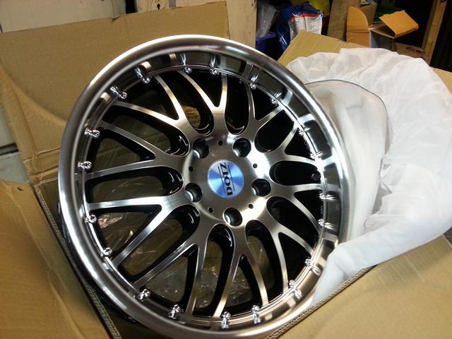 Sedan var jag på Centrala Gummi och hämtade de nya 17" Dots Muggello fälgarna, och bestämde mig för att Momohjulen med fina Good Yeardäck hamnar på Powerbörsen. Tänkte spara dom till 318 men har för mycket däck kvar att köra slut på för det ska vara vettigt.