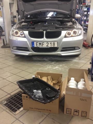Noterat någon droppe mitt under bilen på det i övrigt rena garagegolvet. Det visade sig vid kontroll komma från trågpackningen på växellådan. Läge för att passa på att få det fixat och samtidigt byta olja. Det blev BMWs kit för byte 24152333907 innehållande nytt tråg, 10 l olja, filter och packningar. 5624:- inkl 10% BMW CS rabatt. Ytterligare ett byte av olja har gjorts för att få ur så mycket gammal olja som möjligt. I samband med detta byttes även tätningen till Mechatronicanslutningen.