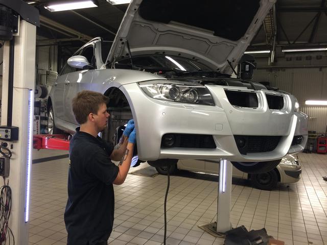 Kjolarna var busenkla att montera, men det var dock allt annat än plug-and-play att få dit fronten. Plasten innanför fick modifieras på flera ställen. Hasplasten fick bytas i sin helhet. Särskilt mittgaller fick köpas med öppning för farthållarradarn. Radarögat kräver även att fronten modifieras meddelst sågning, det finns en mall att köpa på BMW för detta. Det är alltså ingen särskild front för aktiv farthållare utan den måste alltid modifieras. Vi kollade två originalfronter på bilar som levererats med aktiv farthållare. Bägge var handsågade! Detta är dock inget som syns eftersom det täcks av en kåpa.