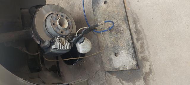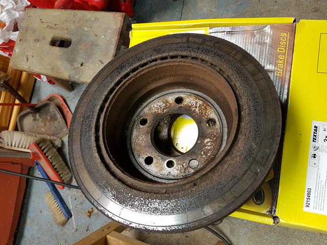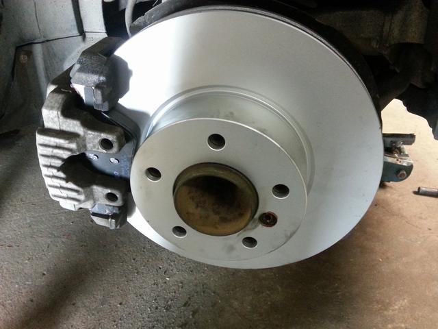 Nya Textar framskivor och Valeobelägg monterat . De gamla skivorna var "söndertvättade" och gav lite vibrationer speciellt med kalla skivor. Dvs man har tvättat bilen och sedan låtit den stå så att bromsbeläggen "rostat på skivan"