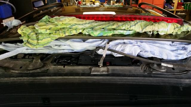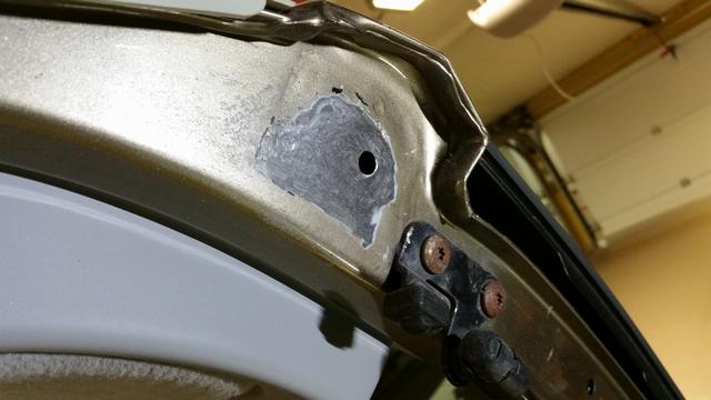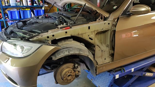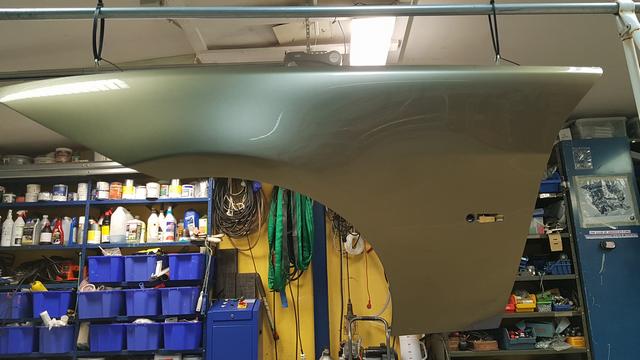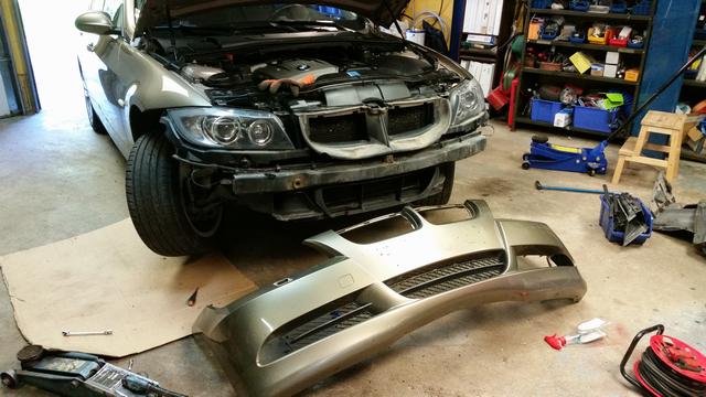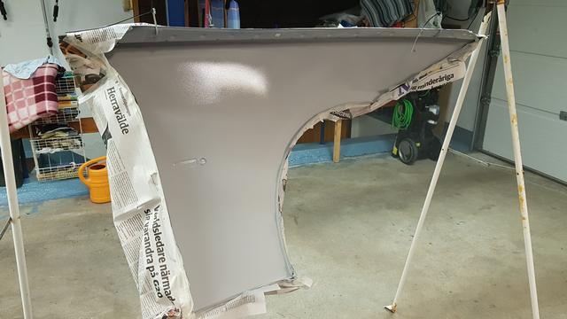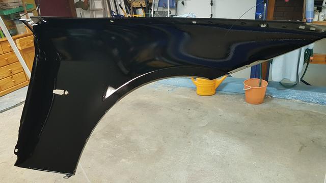 En plastlåda ramlade ned från en hylla på 325an framskärm. Osis. Blev en buckla i framkanten. En ny skärm inhandlades från Tyskland och lämnades till Dysviks billackering. Skärmen hade ett dörruppslag sedan tidigare så ingen idé att lägga jobb på riktning. Oturen kostade 2000 och lite arbete. Att rikta skärmen hade kostat ytterligare nån tusenlapp. Sen ska den ju rostskyddas på baksidan osså grundfärg +svart akryllack.