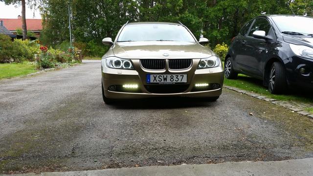 BMW-DRL satsen monterad. En liten intelligent modul känner av när spänningen ökar i bilen vid start och tänder DRL-ljusen och släcker dom efter 5 sekunder när man stängt av bilen. De stängs också av när xenonljusen tänds.