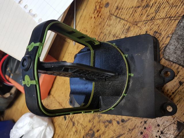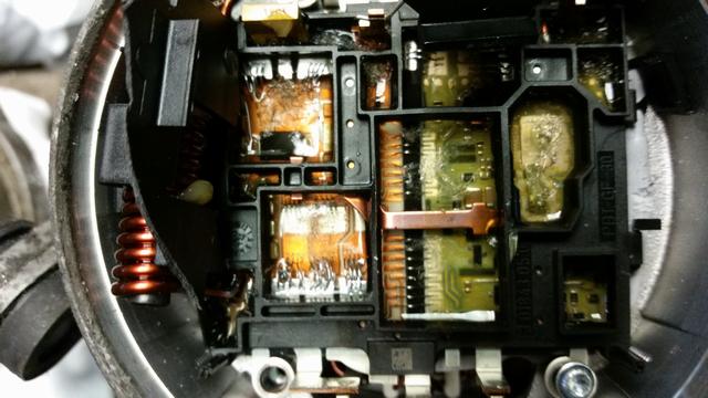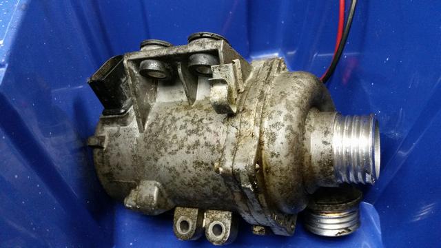 Min elektriska vattenpump havererade på motorvägen utanför Örebro igår. Det tog 3 sekunder från GUL förvarning till RÖD "katastrofvarning" hade man haft en tempmätare hade man sett det mycket tidigare och kunnat planera avfart från motorvägen. Nu fick jag ta till en förbjuden "polisficka" vid sidan av vägen. Och låta bilen svalna en stund. Man kopplade in min Launch diagnos som alltid ligger i bilen och konstaterade att felkod på vattenpumpen. Dessutom lade jag upp både motortempen och kylartempen. När den sjunkit under 100C så körde jag nån kilometer till så jag kom av motorvägen. Och sedan fick jag stanna en stund igen. Sedan fick jag köra och stänga av motorn och rulla. Drog upp bilen i 100km och lät den sedan rulla så långt det gick,klarade sträckan Mosås- Kumla på 4 rullningar. Och håll hela tiden koll på tempen så den höll sig inom ramen som var OK dvs under 115C. Parkerade bilen hos BMW i Kumla och ringde gumman. Där fick den stå och svalna och tog med en dunk vatten men det hade inte försvunnit nått. Körde sedan hem den utan några varningar de sista 3 kilometerna genom Kumla. Rev sedan ned pumpen och den var död elektriskt. Lossade på locket och var lite nyfiken vad som fanns i. En elektronikenhet !!!!! med nån mjuk Jelly och där var det trådar som var av i de "gula rutorna" på bilden. Själva motorn verkade dock var kontakt igenom. Ny pump å termostat ebayades in från Tyskland för ca 3000 kr inklusive frakt.