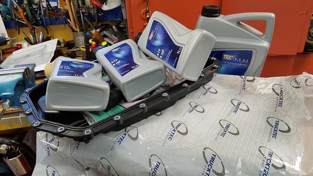 Ett servicekit till Automatlådan kom med posten, filter och 8 liter olja från Autoteile i Tyskland.