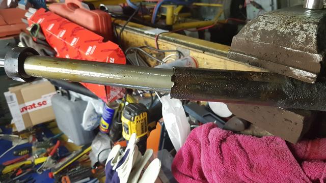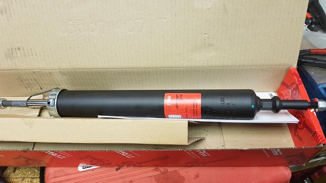 Att stötdämparen var trasig rådde inga tveksamheter om och det var bara sopor den hade spruckit helt enkelt. Så nu sitter det två nya TRW med tillbehör . Tråkigast är att riva inredningen i skuffen. Men det får gå det med.