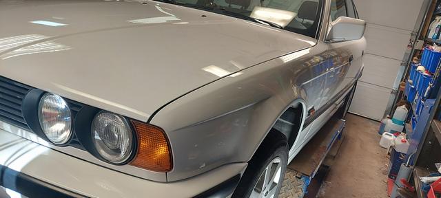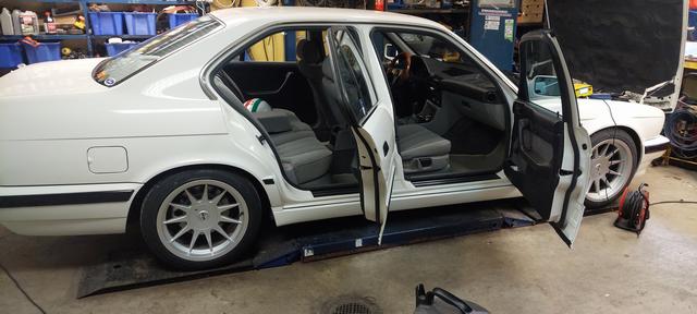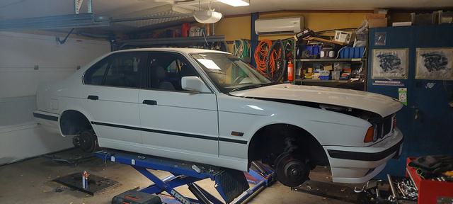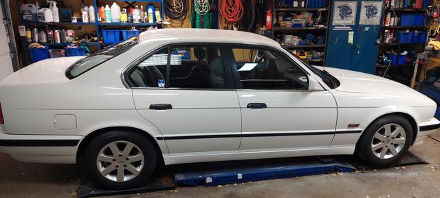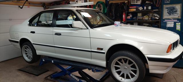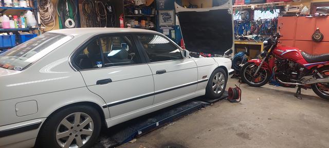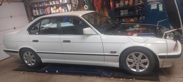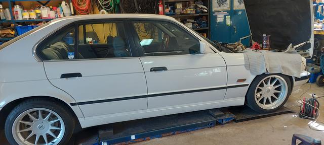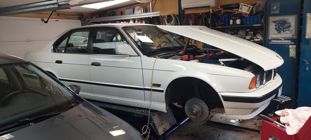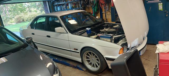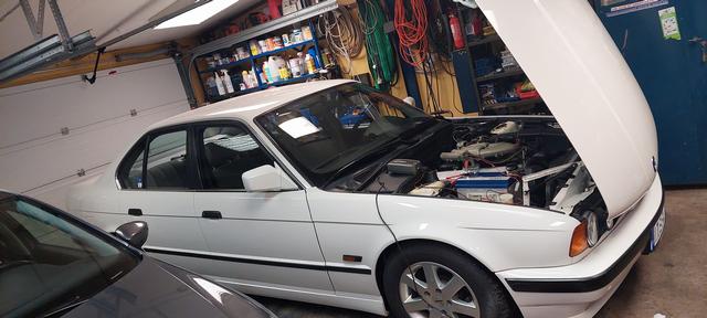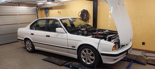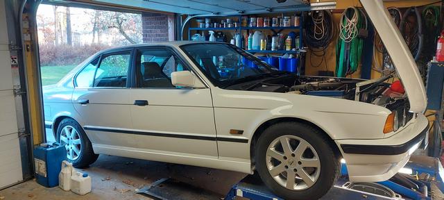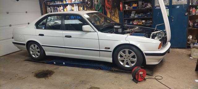 Ny olja och filter. Och kylsystemet urspolat och återfyllt och sedvanligt luftningsläge för E34. Vinterhjulen på så man kan köra hem den för batteriladdning om vädret tiilåter.