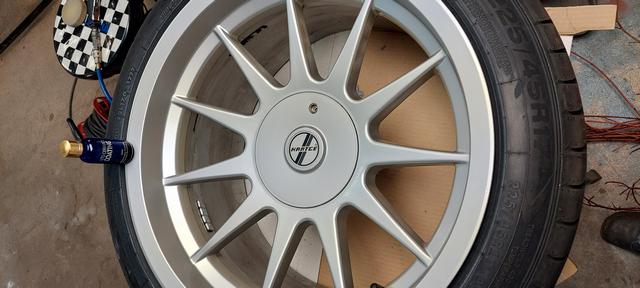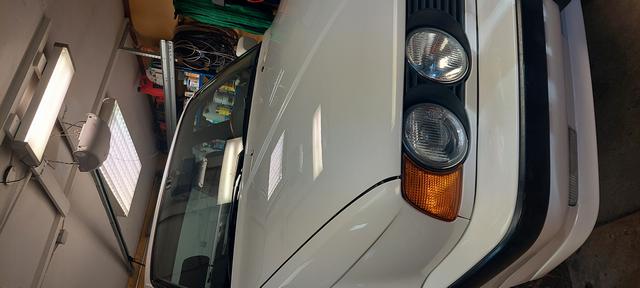 I väntan på att kylarslangarna ska anlända, så blev det ett varv med polermaskinen. Noterade igår när jag backade och körde framåt igen för att kolla bromsarna att ena framhjulet flyttade på sig. Så det var bara att beställa ett kit med framvagnsdelar också, gummit i bussningar har torkat sönder gissar jag. Vinterhjulen åkte på också. utifall jag måste flytta den.
