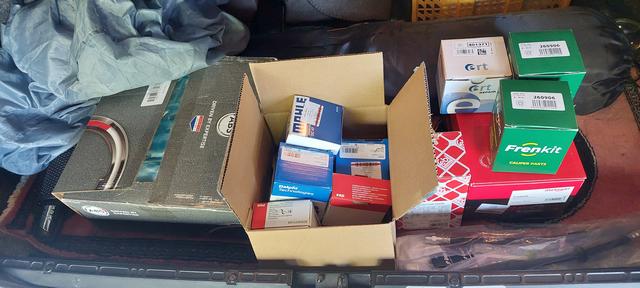 Dags för lite service inför vintervilan. Olja filter ska bytas. Kylsystemet ska tömmas och spolas ur. Kylvätskan blev rostbrun ganska omgående vid kamrem och vattenpumpsbytet, därav storbaljan. Det har inhandlats bromsskivor bak.Ett bromsok bak samt 3 renoveringskit till de övriga. Ytterbälgarna är dåliga och gör att kolvarna nyper när de ska gå tillbaka ibland. Blir 4 nya bromsslangar också.