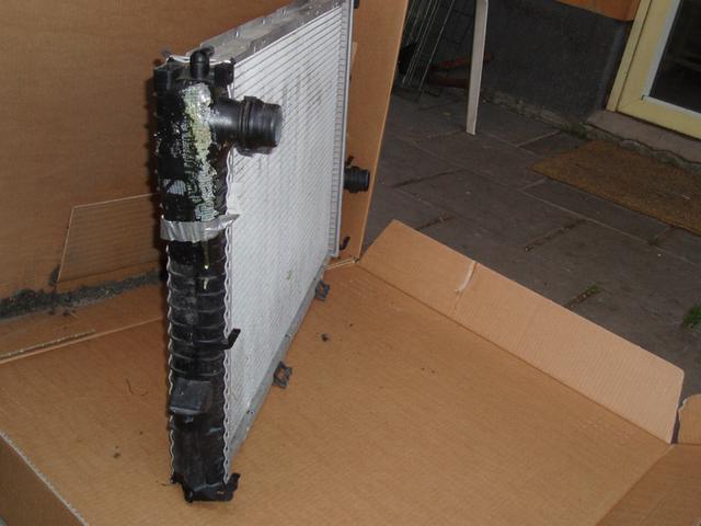 Gamla kylaren framifrån. Var riktigt fräsch och rak inga skador på lamellerna. men ingen kylare är starkare än dens svagaste punkt, i det här fallet de obergripliga plastsidorna. Varför man blandar in plast i konstruktionen kommer jag aldrig att förstå.......